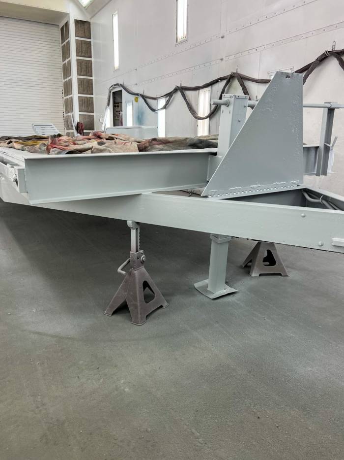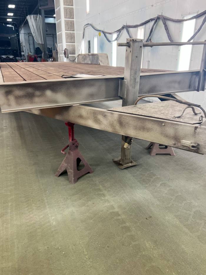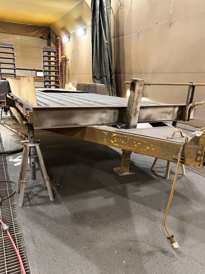 The first step in the rust removal process on this job is trailer sandblasting. Sandblasting is used to remove paint, rust, or any other residues from the surface for new paint to adhere correctly. Sandblasting equipment propels a high-pressure stream of air and abrasive particles at a target, effectively cleaning the surface of all contaminants.
